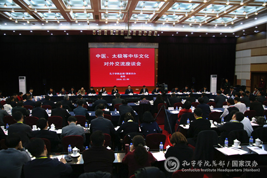 12月9日,第十一届孔子学院大会即将开幕之际,孔子学院总部在昆明召开中医、太极等中华文化对外交流座谈会。教育部副部长郝平出席并发表讲话。教育部体育卫生与艺术教育司、国家体育总局、国家中医药管理局、有关省(区、市)教育厅(委)、全国30余所中医药和体育院校、部分孔子学院中方承办院校与北京同仁堂集团等有关负责同志参加会议。