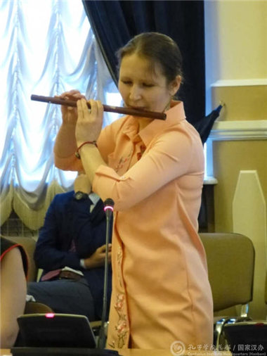 圣彼得堡国立大学法律系学生米勒左耶夫·法利德用流利的汉语向大家介绍了自己学习汉语的经历和为增进两国友谊而工作的理想。东方系学生珀丽娜·布茨克为大家吹奏了笛子曲《梦里水乡》,管理系学生艾斯嘉为大家献上欢快幽默的快板《老外学汉语》,赢得了现场嘉宾的热烈掌声和高度赞扬。