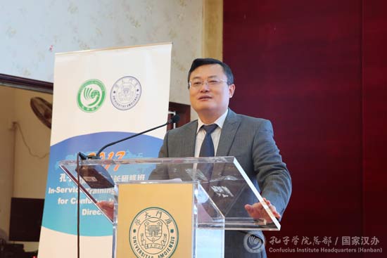 赵国成副主任在致辞中指出,孔子学院由中外双方合作共建,致力于满足世界各国人民对汉语学习的需要,增进世界各国人民对中国语言文化的了解,加强中国与世界各国教育文化交流合作。他强调,孔子学院功能的发挥,院长起到核心作用,是孔子学院可持续发展的关键因素。希望各位参训院长抓住“教育、语言、合作”这三个要点,同中方院长紧密合作,把孔子学院办好,在目前复杂的国际形式下,为发展中国与所在国的友好关系,促进世界多元文化发展作出贡献。