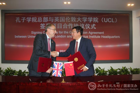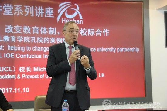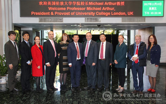 11月10日,英国伦敦大学学院(University College London)校长Michael Arthur一行访问孔子学院总部。孔子学院总部党委书记、副总干事马箭飞与Michael Arthur校长会谈并共同签署合作备忘录,双方将在英国汉语教学情况调研、本土汉语师资培养等方面加深合作。签字仪式结束后,Michael Arthur校长在名师讲堂做了题为《孔子学院的催化剂作用:改变教育体制、提升校际合作》精彩讲座,国家汉办领导和全体员工出席。