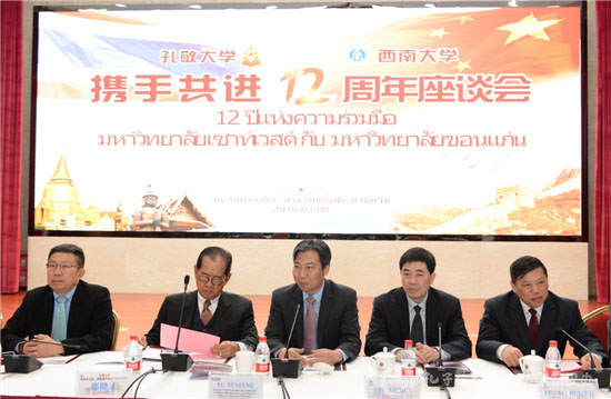 3月8日,“西南大学-孔敬大学携手共进12周年座谈会”在中国西南大学东方红会议厅召开。孔敬大学理事会一行49人在泰国前能源部长那隆才 (Norongchai)的率领下出席了会议。