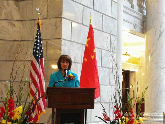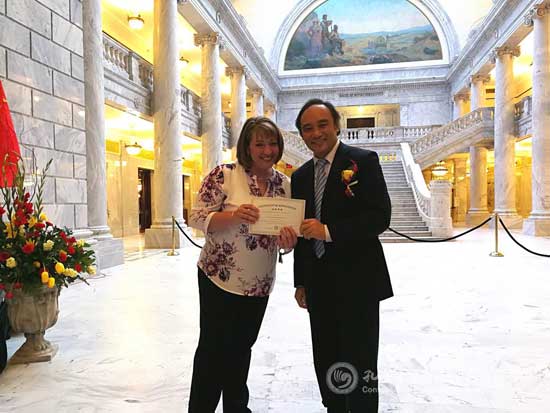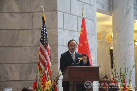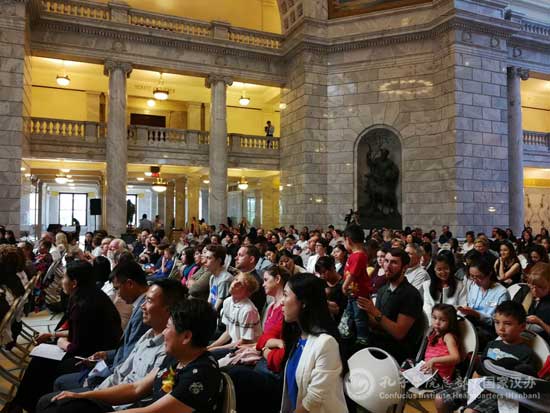 在庄严宏伟的犹他州议会大厦穹顶大厅里,400个座位座无虚席。犹他州教育厅厅长悉尼·迪克森(Sydnee Dickson),孔子学院总部副总干事、国家汉办副主任赵国成,美国大学理事会中国语言与文化项目主任戴静山(Robert Davis),戴维斯学区孔子学院外方院长福碧宁(Bonnie Flint),教育厅以及各学区、学校的官员和合作教师,志愿者教师代表、志愿者接待家庭、学生和家长近400名中美嘉宾与会。赵国成和悉尼·迪克森分别致辞。