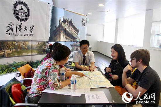 法国首届HSK留学就职展吸引了众多的汉语学习者。图为从法国里尔赶来的两位学生正在武汉大学展台前咨询。