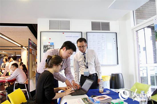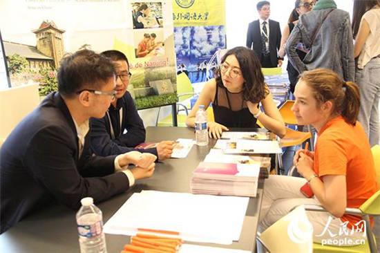 南京大学展台前,一名法国学生正在咨询。
