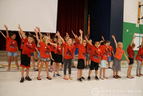 6月14日,夏令营闭幕仪式上,学生们穿着统一的大红色体恤衫分组为家长表演了精心准备的中文节目,还邀请家长检验自己的学习成果,展示自己的中文能力。