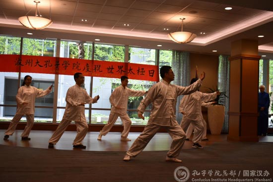 由波特兰州立大学孔子学院公派教师左步雷带队的杨氏太极方阵,将他们对太极的理解融合在动静相间、刚柔相济的肢体语言之中,体现了和谐健体、益寿延年的柔缓太极运动理念。