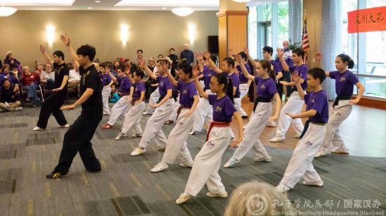 波特兰州立大学孔子学院公派教师、世界武术冠军吴晓龙和美国武术中心教练谢晓鑫带领20位少儿组学员演示的“十二生肖拳”,可以说口号声与呐喊声声声入耳,地板震动间,颇有雷霆万钧之势。