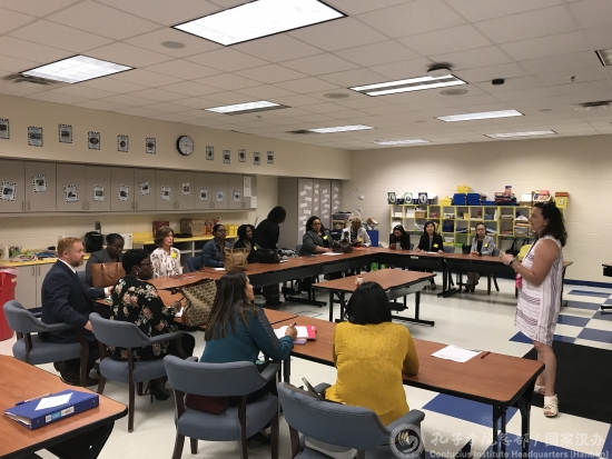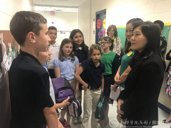 当地时间4月30日,美国萨凡纳州立大学孔子学院中方院长罗其娟一行访问南卡罗莱纳州希尔顿首脑小学,走进中英双语沉浸式项目的课堂参观学习。