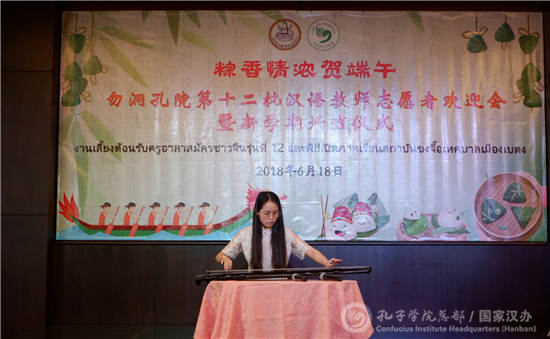 随后,陈文向现场嘉宾介绍了勿洞市孔子学院新学期教学情况,志愿者教师将被派往勿洞市9所合作学校,向1500多名中小学生提供汉语、书法、舞蹈等课程。同时,孔子学院在本部开设了成人汉语夜班、周末青少年汉语精英俱乐部、蓝天合唱团、少儿合唱团等课程和活动,约有200多名学员。并将在新学期开展中学生赴华团、本土汉语教师培训等重点项目。
