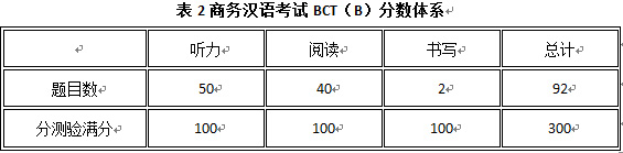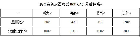 商务汉语考试BCT(A)全卷包含听力、阅读、书写三个分测验,全卷满分300分。分数体系,详见下表: