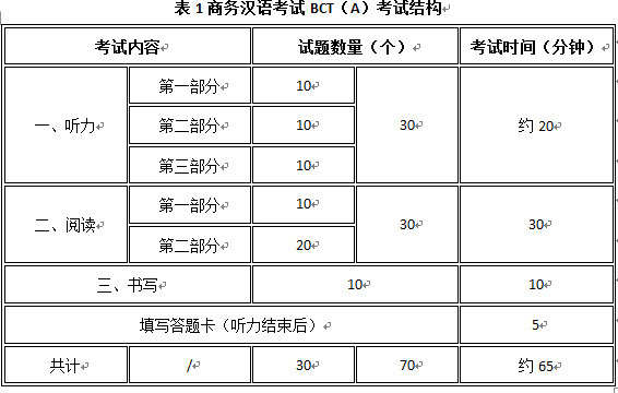 商务汉语考试BCT(A)试卷共70题,分听力、阅读、书写三部分。